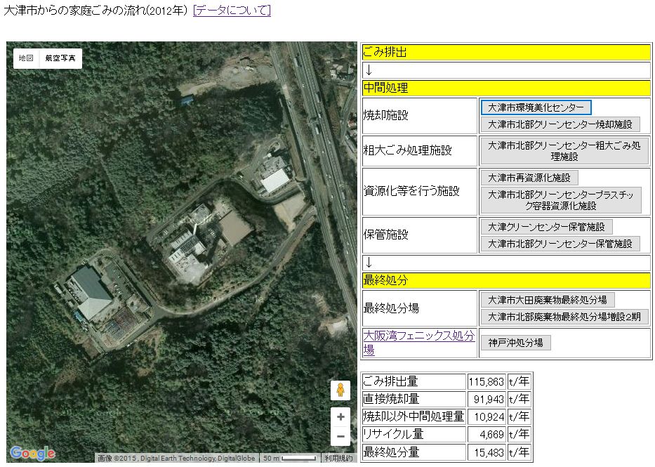 焼却施設、リサイクル施設、最終処分場など、あなたのごみがどこで処理されているのか、航空写真で表示します。市町村ごとに、家庭ごみが処理される流れがわかります(関西二府四県限定)。